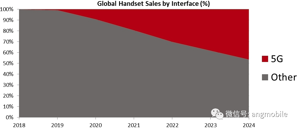 业内对此持乐观态度。权威行业组织---5G Americas在9月末发布的最新预测数据显示,到今年年底,全球将有77个商用5G网络。此外,市场研究与咨询公司Strategy Analytics在10月初发布预测数据,认为5G智能手机的销量将从2020年开始“激增”,5G手机将在2024年之前占到占全球所有手机销量的近一半(如下图所示)。