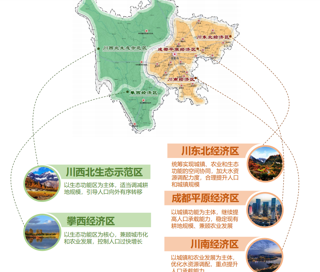而且还要引导这两个片区的人口转移到川东北、成都平原、川南这3个经济区,而这3个经济区,则是要加强城镇化进程,稳定提升人口和城镇规模。