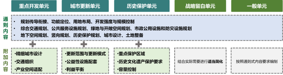 区分重点开发、城市更新、历史保护、战略留白等不同单元类型,明确差异化附加内容与技术路径,以适应空间需求的多样化与空间管控的差异化。