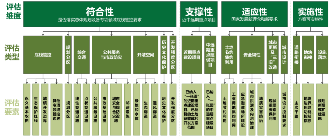 从底线约束方面考虑,对控规与总规强制性内容及纳入国土空间规划“一张图”实施监督信息系统(以下简称“一张图”系统)的专项规划进行符合性评估。从重大项目保障方面考虑,对控规与已纳入“一张图”系统的近中远期重点建设项目进行支撑性评估。从城市建设新理念方面考虑,对控规与土地节约集约利用、安全韧性等新理念新要求进行适应性评估。从规划可行性方面考虑,对控规道路衔接、地块衔接、设施落地等进行实施性评估。