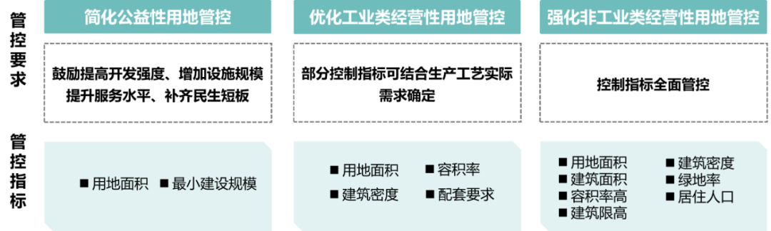 同时提高各类地块动态适应能力。简化公益性用地管控,鼓励提高公益性用地的开发强度;优化工业类经营性用地管控,允许部分控制指标结合项目具体需要予以明确;强化非工业类经营性用地管控,对控制指标进行全面管控。